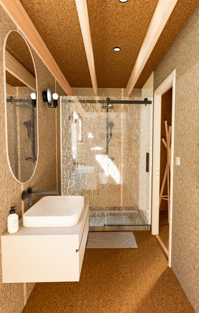 Les murs sont en ossature bois de section 45×70 mm, préfabriqués sous forme de modules qui se vissent entre eux. Le bardage se présente également sous forme de panneaux qui se fixent sur les murs. La couverture est en EPDM, assurant une étanchéité parfaite et durable, avec une boîte à eau en PVC et un coude d’évacuation inclus. Les studios doivent être installés sur une dalle en béton. N’oubliez pas de prévoir l’arrivée d’eau et d’électricité.
